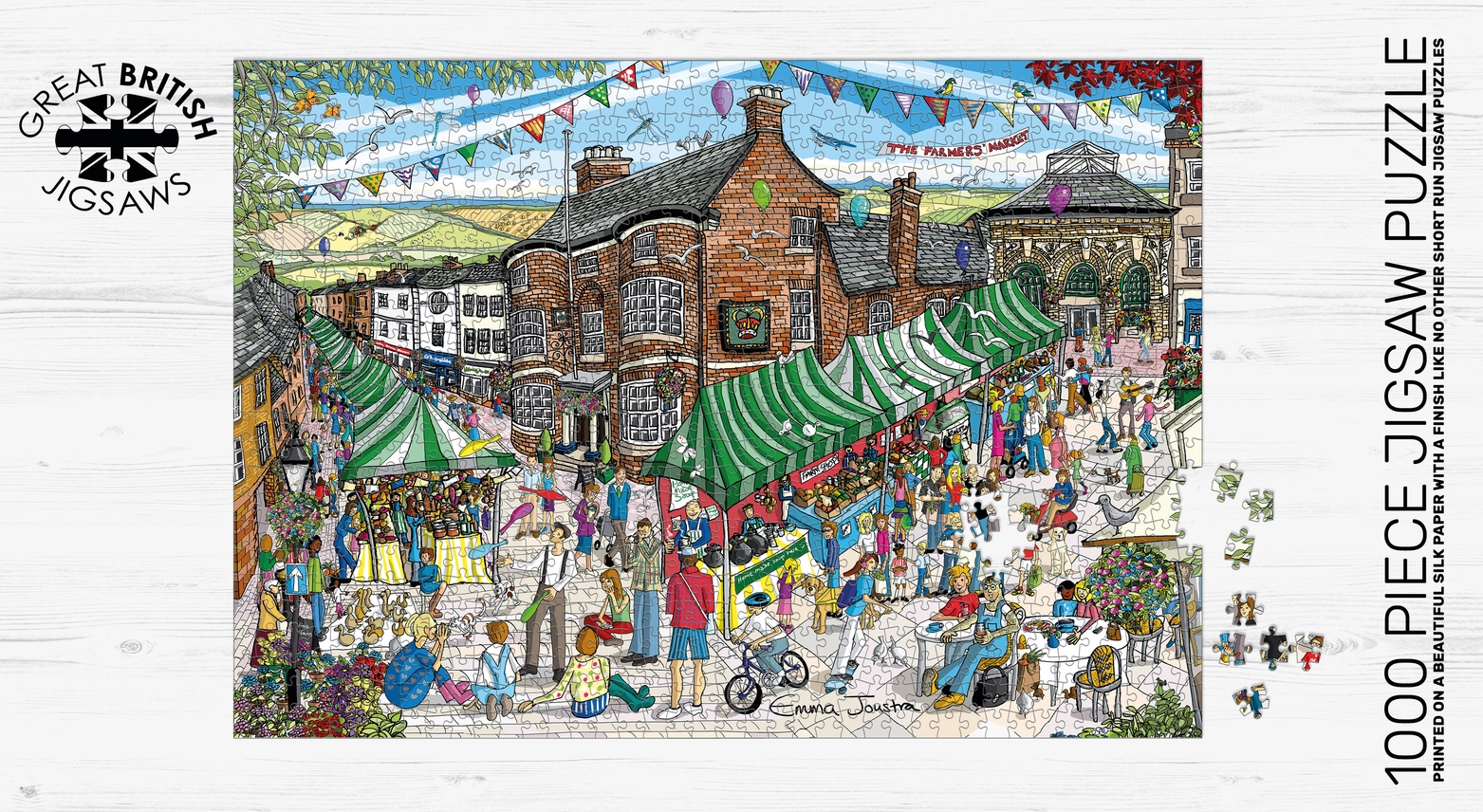 Fördjupa dig i den livliga och livliga atmosfären på en traditionell bondemarknad med Emma Joustra pussel med 1000 delar. Detta vackert detaljerade pussel fångar essensen av det brittiska landsbygdslivet, erbjuder timmar av underhållning och avkoppling när du sätter ihop varje färgstark scen. Lägg till en touch av charm och nostalgi till din pusselsamling med detta härliga Farmers Market-pussel från Great British Jigsaw.